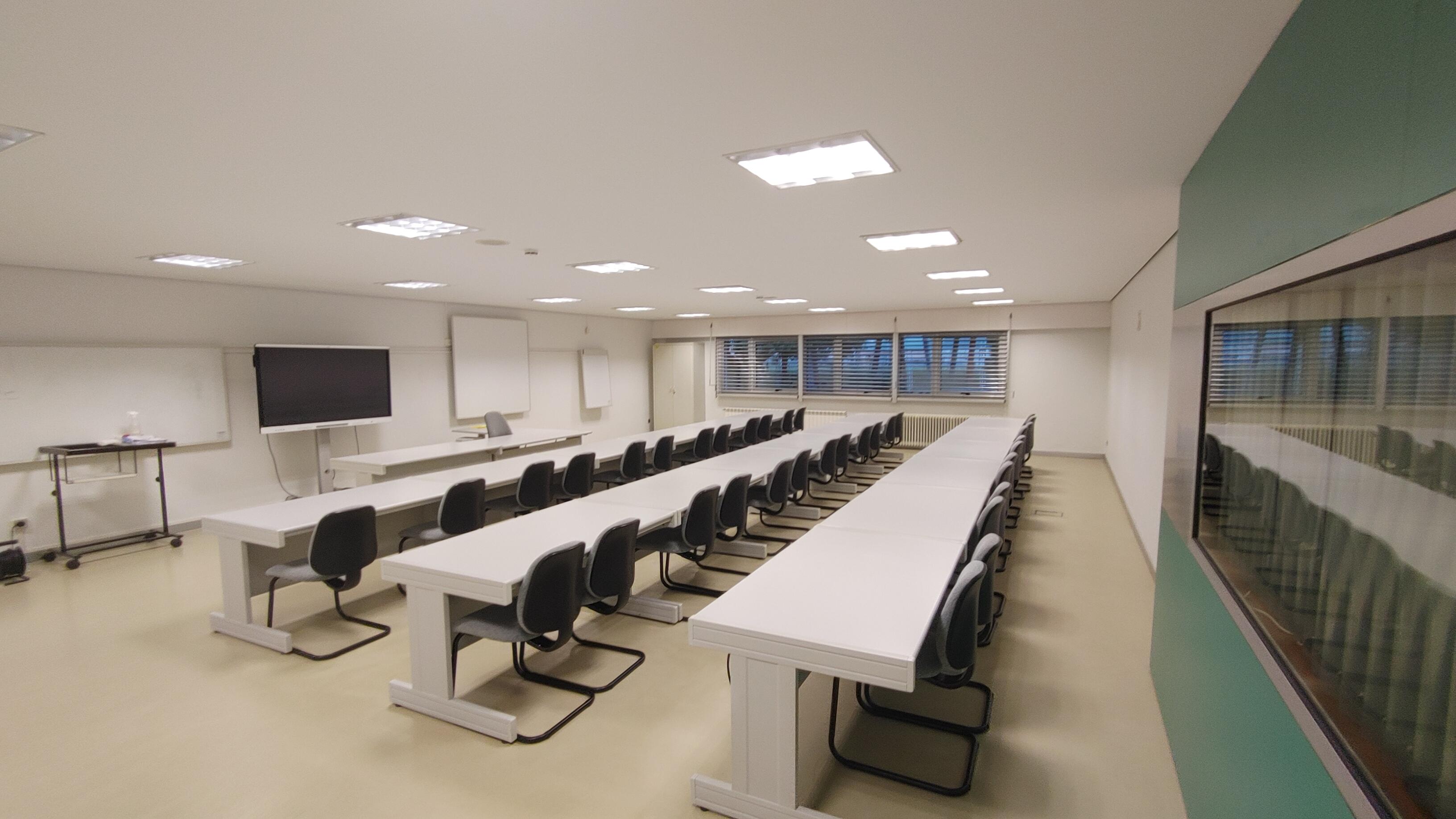 Este espacio cuenta con pizarra para rotuladores, pantalla y proyector. Además dispone de mesas y sillas para hasta 36 asistentes.